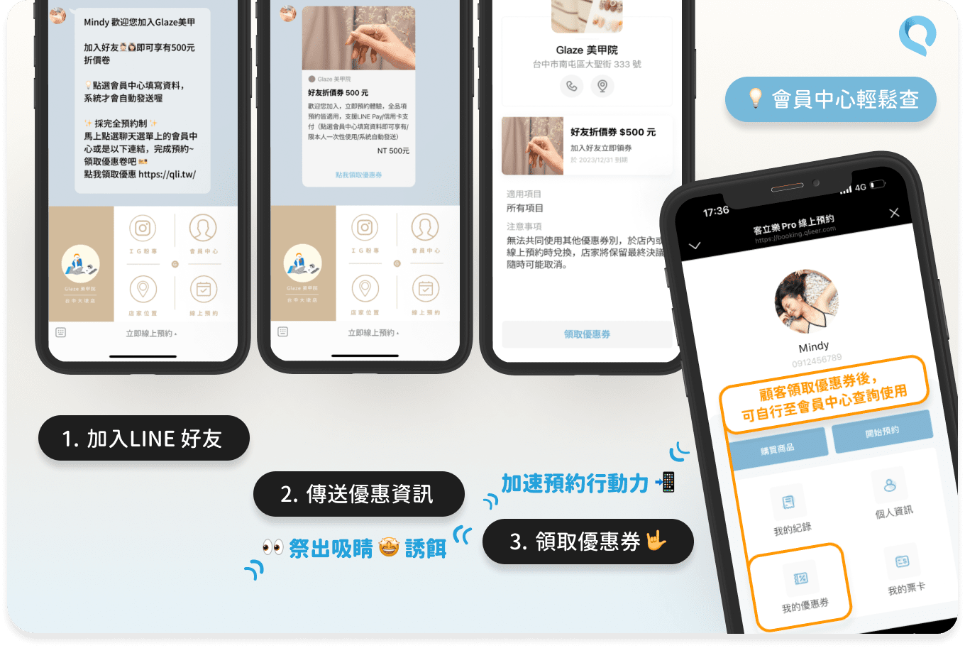 美業商家能夠透過以上13種行銷方式,互相搭配使用,有效吸引顧客加入商家LINE好友,「加入好友的歡迎訊息」送出客立樂Pro新客體驗優惠券連結,讓初次加入的朋友領取後就能將優惠券收入在個人會員中心。