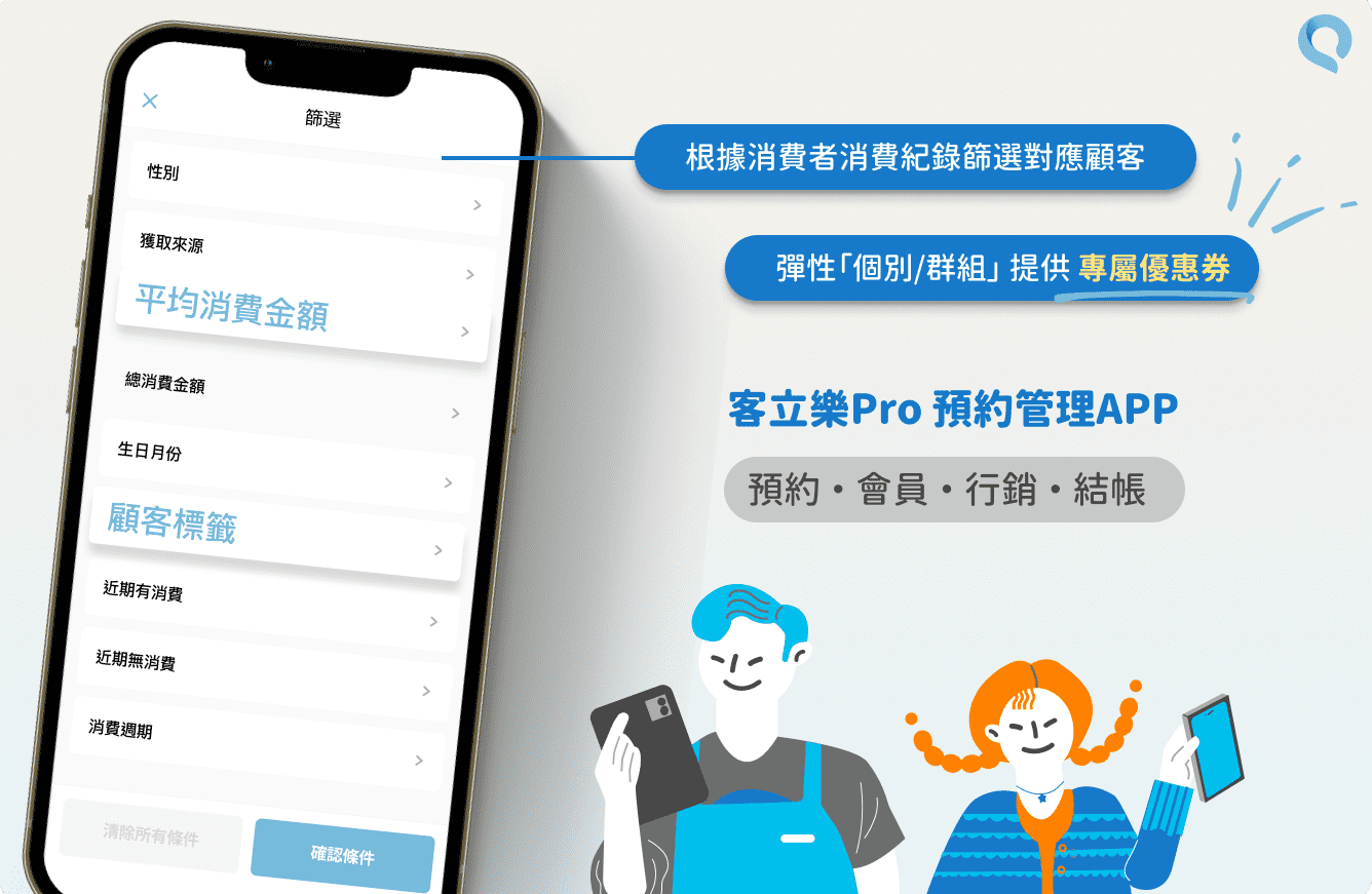 客立樂Pro預約APP提供美業店家最完整的「美業行銷優惠券」指南,美容美體、美髮沙龍、美甲美睫、霧眉採耳、男士沙龍、寵物美容、運動按摩、油壓按摩業者只要透過美容POS系統內建的行銷模組,店家可以快速產生專屬行銷策略,有效商家的會員經營。不僅能提升美業品牌的銷售和知名度,與客人建立緊密的關係,並創造更多商機。客立樂Pro協助美業店家在市場上脫穎而出,輕鬆經營店鋪,達到驚人的商家行銷成效。