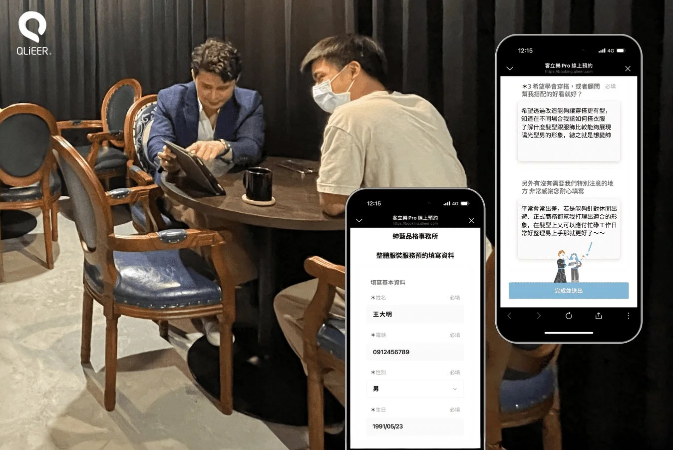 由於形象改造需要深度了解顧客會員,紳藍品格也透過客立樂Pro 預約管理APP優化顧客體驗,預約制的服務,顧客在線上預約後會收到預約確認外,更會在 LINE 預約完成後收到一封問卷表單,讓顧客填寫後,店家能事前收到顧客的個人資訊分享,如星座、職業、改造目的、想學會穿搭的需求等,專屬顧問因此能在顧客到店前就已經先了解顧客基本資料與改造目的,讓諮詢服務能夠更深度進行,當然改造成效也因此大幅提升!