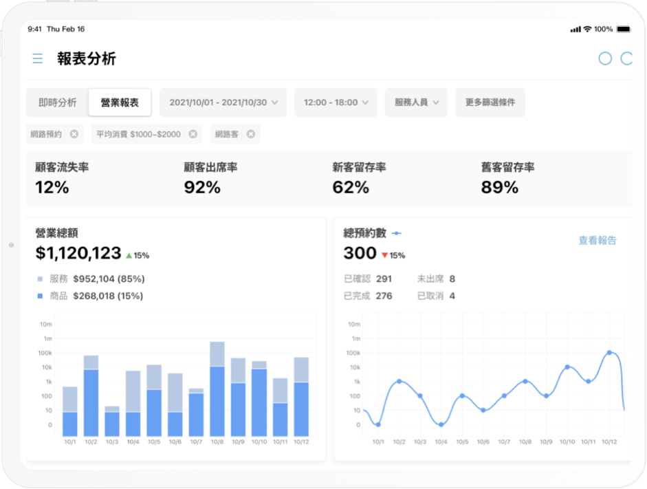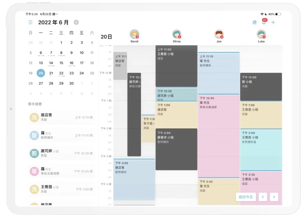 想計算營業額,客立樂的報表分析很方便,如果是多人的店,例如髮廊,也可以從後台設定每位髮型師的預約,就可以知道各自的預約狀況。