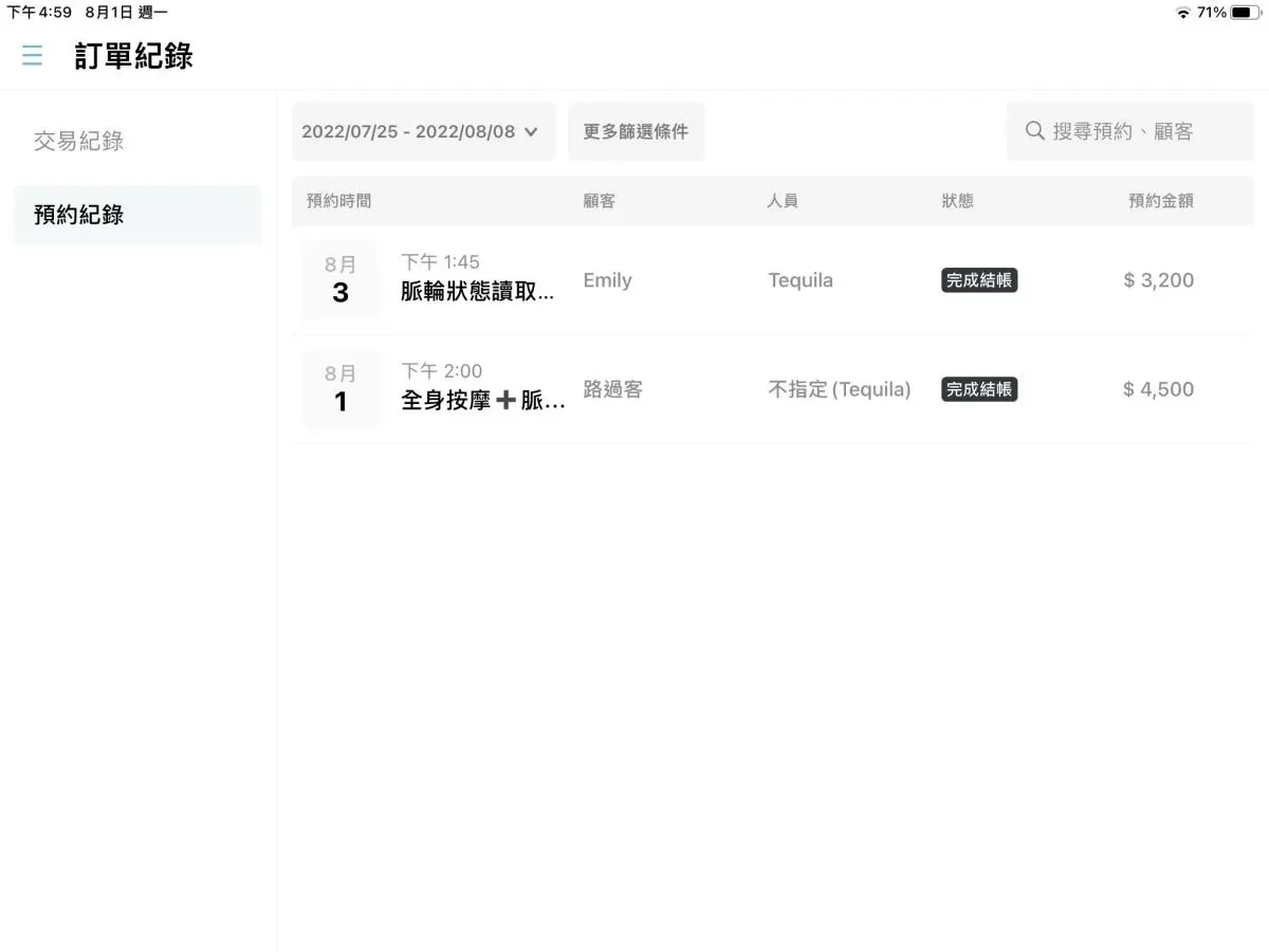 訂單記錄可以看出日期區間的預約狀況,以及是否結帳完成。