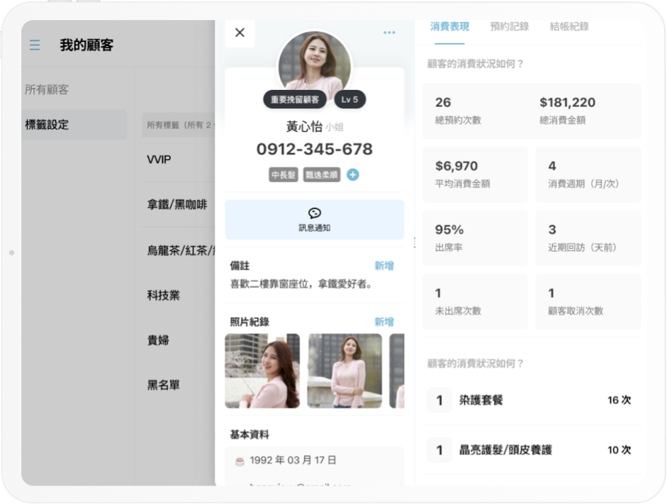 一樣借官方圖來說明:未來只要輸入她的電話或姓名,就會跳出這頁資料,立刻查到這位顧客的標籤還有照片,這些幫助我記憶客人的資訊,顧客也不會看到我的備註。